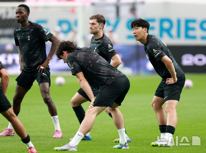 [서울=뉴시스] 이영환 기자 = 토트넘 홋스퍼 손흥민이 3일 오후 서울 마포구 서울월드컵경기장에서 진행되는 2025 쿠팡플레이시리즈 뉴캐슬 유나이티드와 토트넘 홋스퍼의 경기에 앞서 몸을 풀고 있다. 2025.08.03. [email protected]