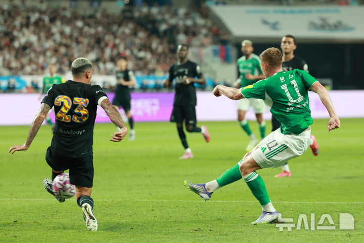 [서울=뉴시스] 이영환 기자 = 3일 오후 서울 마포구 서울월드컵경기장에 열린 2025 쿠팡플레이시리즈 뉴캐슬 유나이티드와 토트넘 홋스퍼의 경기 전반전, 뉴캐슬 하비 반스가 동점골을 넣고 있다. 2025.08.03. [email protected]