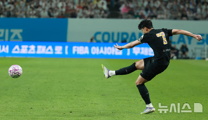 [서울=뉴시스] 이영환 기자 = 3일 오후 서울 마포구 서울월드컵경기장에 열린 2025 쿠팡플레이시리즈 뉴캐슬 유나이티드와 토트넘 홋스퍼의 경기 후반전, 토트넘 손흥민이 크로스를 올리고 있다. 2025.08.03. [email protected]