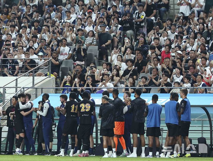 [서울=뉴시스] 김근수 기자 = 토트넘 홋스퍼 손흥민이 3일 오후 서울 마포구 서울월드컵경기장에서 열린 2025 쿠팡플레이시리즈 뉴캐슬 유나이티드와 토트넘 홋스퍼의 경기에서 눈물을 흘리며 교체 아웃되고 있다. 2025.08.03. [email protected]
