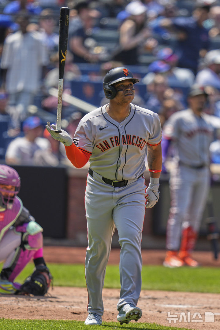 [뉴욕=AP/뉴시스] 샌프란시스코 자이언츠의 라파엘 데버스가 3일(현지 시간) 미 뉴욕주 뉴욕의 시티 필드에서 열린 2025 메이저리그 뉴욕 메츠와의 경기 3회 초 3점 홈런을 친 후 타구를 바라보고 있다. 이날 이정후는 4타수 4안타 2득점 1볼넷 1도루를 기록했고 샌프란시스코는 12-4로 대승했다. 2025.08.03.