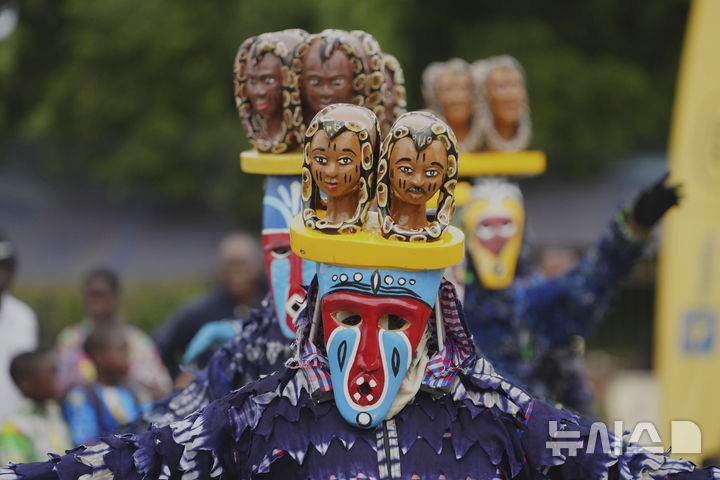 [포르토노보=AP/뉴시스] 3일(현지 시간) 베냉 수도 포르토노보에서 열린 제2회 가면 축제에서 다양한 가면과 의상의 참가자들이 행진하고 있다. 이 축제에서는 신성한 종교적 의미를 지닌 마스크부터 세속적 의미의 가면까지 다양한 마스크를 착용한 참가자들이 거리를 누빈다. 2025.08.04.