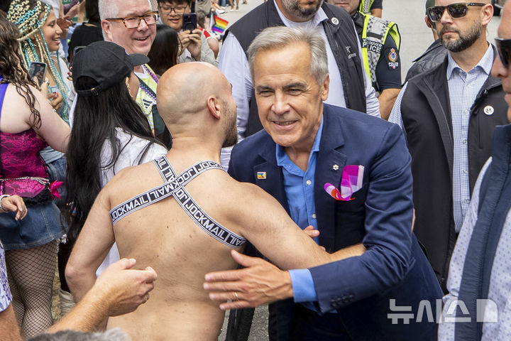 [밴쿠버=AP/뉴시스] 마크 카니(오른쪽) 캐나다 총리가 3일(현지 시간) 캐나다 브리티시컬럼비아주 밴쿠버에서 열린 프라이드 퍼레이드에 참석해 행진하면서 참가자들과 인사를 나누고 있다. 2025.08.04.