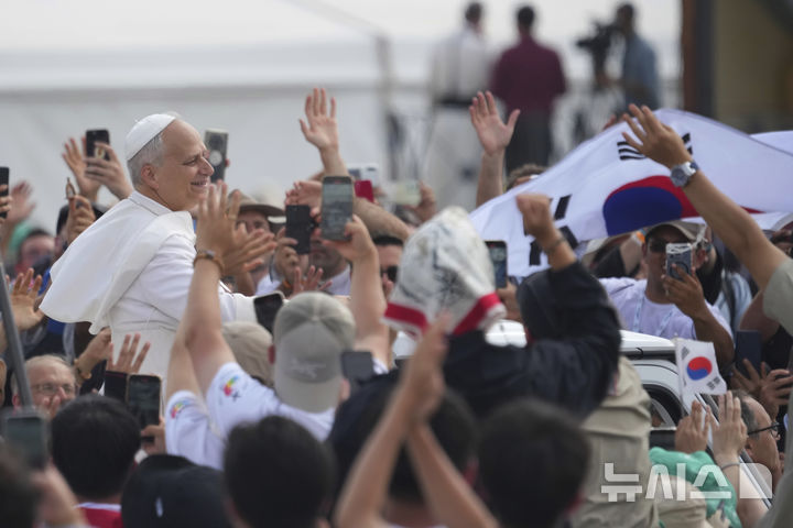 [로마=AP/뉴시스] 교황 레오 14세가 3일(현지 시간) 이탈리아 로마 외곽 토르 베르가타 광장에서 열린 '젊은이의 희년' 미사 집전을 마치고 행사장을 떠나는 동안 한국 청년 순례자들이 태극기를 흔들며 인사하고 있다. 교황은 이날 2027년 세계청년대회(WYD)를 8월 3일부터 8일까지 대한민국 서울에서 개최한다고 공식 발표했다. 2025.08.04.