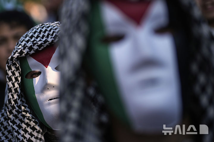 [이스탄불=AP/뉴시스] 3일(현지 시간) 튀르키예 이스탄불에 있는 미국 영사관 앞에서 팔레스타인 깃발 색상의 가면을 쓴 친팔레스타인 시위대가 가자지구에서의 전쟁 종식을 외치며 시위하고 있다. 2025.08.04.