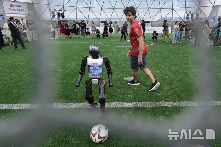 [베이징=AP/뉴시스] 4일(현지 시간) 중국 베이징에서 열리는 '2025 세계 휴머노이드 로봇 게임'을 앞두고 언론 공개 행사가 열린 가운데 부스터 휴머노이드 로봇들이 축구 시범 경기로 기술을 선보이고 있다. 오는 14일부터 17일까지 열리는 이 행사에는 축구를 비롯해 달리기, 격투, 댄스 등 실제 사람의 경기와 유사한 종목이 포함된 것으로 알려졌다. 2025.08.04.