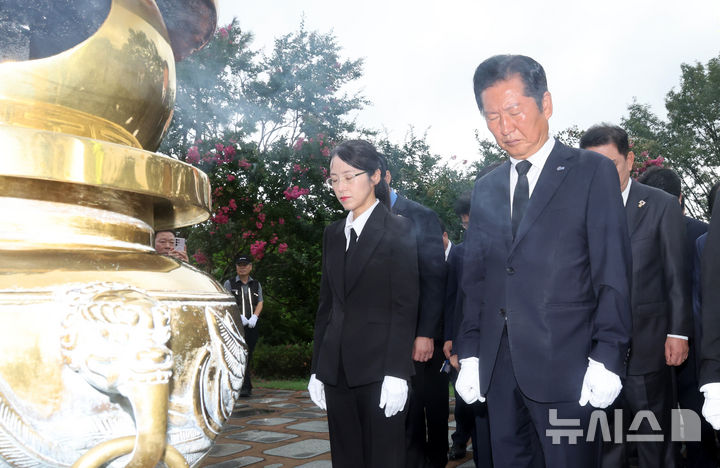 [서울=뉴시스] 황준선 기자 = 정청래 더불어민주당 신임 대표가 4일 오전 서울 동작구 국립서울현충원 내 고 김대중 전 대통령 묘역을 찾아 묵념하고 있다. (공동취재) 2025.08.04. [email protected]