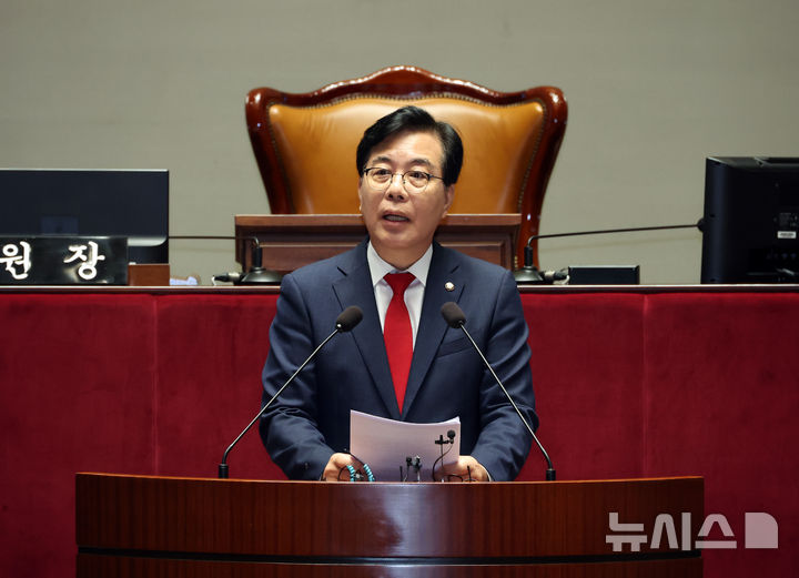 [서울=뉴시스] 김금보 기자 = 송언석 국민의힘 비상대책위원장 겸 원내대표가 4일 서울 여의도 국회에서 열린 의원총회에서 발언을 하고 있다. 2025.08.04. [email protected]