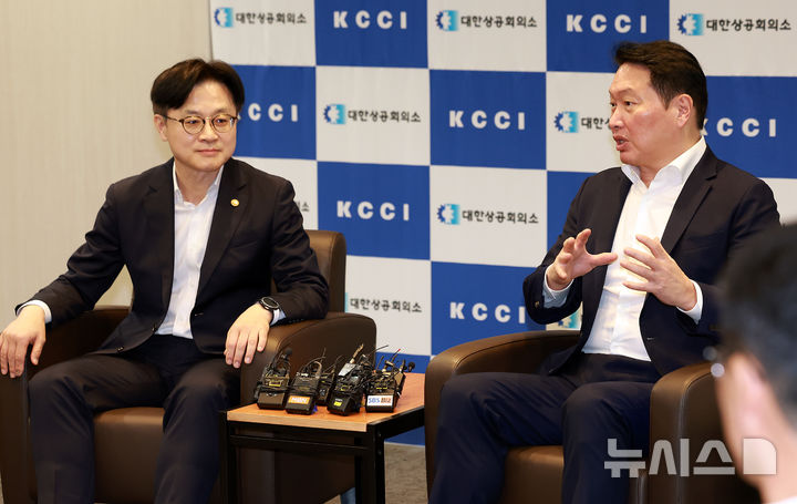 [서울=뉴시스] 이영환 기자 = 김정관(왼쪽) 산업통상자원부 장관과 최태원 대한상공회의소 회장이 4일 오후 서울 중구 대한상공회의소 대접견실에서 면담을 하고 있다. 2025.08.04. [email protected]