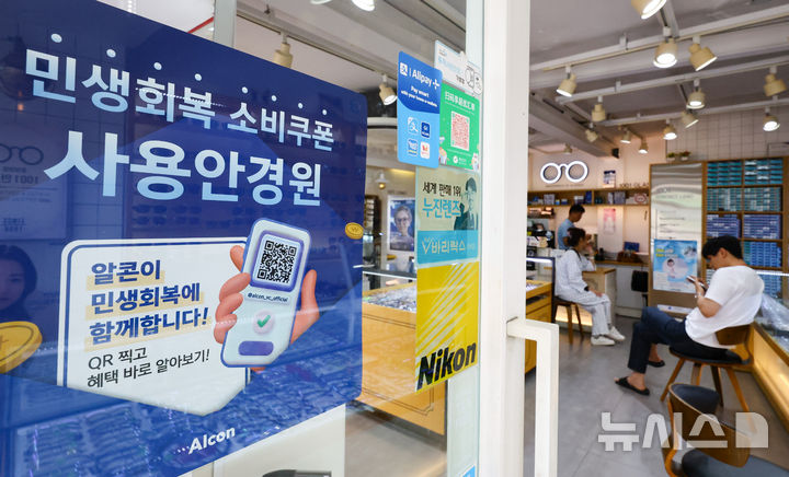 [서울=뉴시스] 황준선 기자 = 4일 서울 시내 한 안경원에 민생회복 소비쿠폰 사용 가능 매장 안내문이 게시돼 있다.