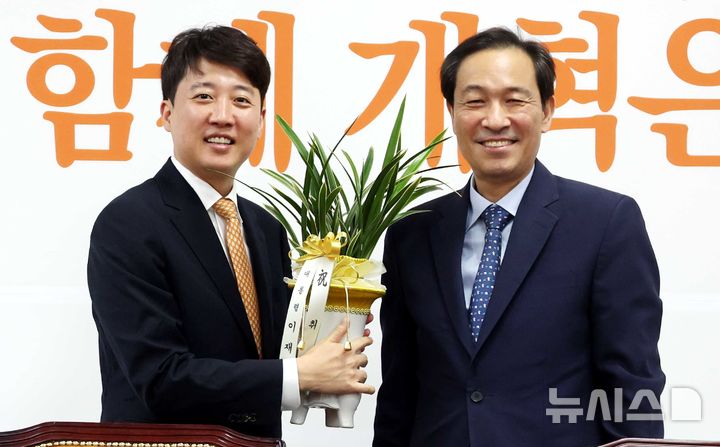 [서울=뉴시스] 조성봉 기자 = 우상호(오른쪽) 대통령비서실 정무수석이 4일 오후 서울 여의도 국회에서 이준석 개혁신당 대표에게 대통령이 보낸 당대표 취임 축하난을 전달한 뒤 기념촬영을 하고 있다. 2025.08.04. [email protected]