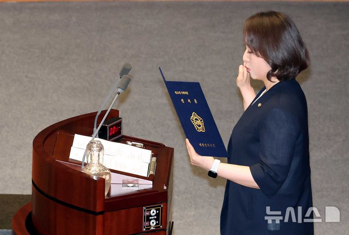 [서울=뉴시스] 조성봉 기자 = 비례대표 의원직을 승계한 이주희 더불어민주당 의원이 4일 오후 서울 여의도 국회에서 열린 제427회국회(임시회) 제3차 본회의에서 의원 선서를 하고 있다.  2025.08.04. [email protected]