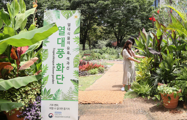 [서울=뉴시스] 조성우 기자 = 4일 서울국제정원박람회가 진행 중인 서울 동작구 보라매공원에서 관람객들이 농촌진흥청 국립원예특작과학원이 조성한 열대풍 화단을 감상하고 있다. (사진=농촌진흥청 제공) 2025.08.04. [email protected] *재판매 및 DB 금지