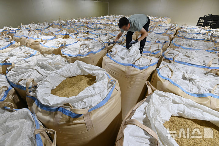 [화성=뉴시스] 김종택 기자 = 과잉 생산된 쌀을 정부가 의무적으로 매입하는 내용의 양곡관리법 개정안이 국회 본회에 통과된 4일 경기 화성시 남양읍 수라청농협쌀조공법인 저온창고에서 관계자가 보관중인 쌀을 살펴보고 있다. 2025.08.04. [email protected]