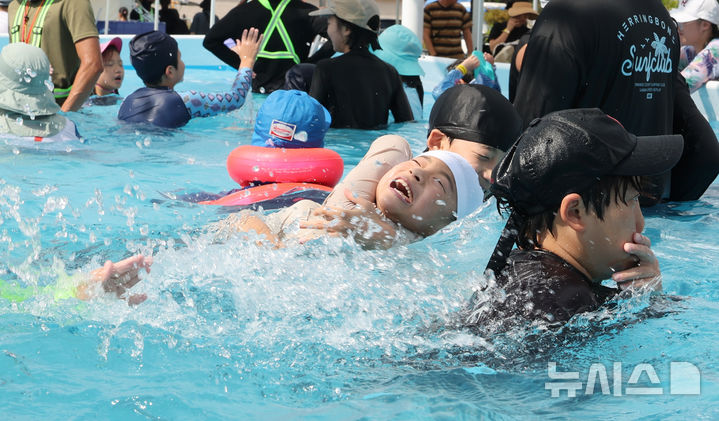 [서울=뉴시스] 김명원 기자 = 4일 서울 종로구 광화문 광장 대형 수영장과 대형 워터 슬라이드 등이 있는 '2025 서울썸머비치'에서 어린이들이 물놀이를 하며 더위를 식히고 있다.  2025.08.04. [email protected]