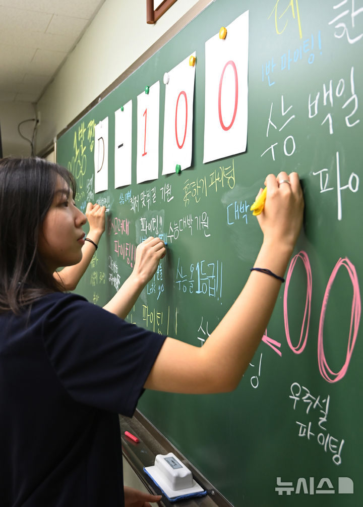 [수원=뉴시스] 김종택 기자 = 2026학년도 대학수학능력시험 100일을 하루 앞둔 4일 경기 수원시 영통구 태장고등학교에서 고3 수험생들이 칠판에 수능 응원 메시지를 쓰고 있다. 2025.08.04. [email protected]