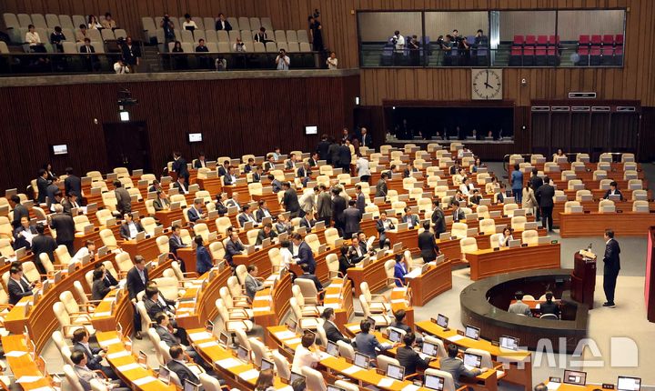 [서울=뉴시스] 조성봉 기자 = 신동욱 국민의힘 의원이 4일 오후 서울 여의도 국회에서 열린 제427회국회(임시회) 제3차 본회의에서 방송3법 반대 필리버스터(무제한토론)를 시작하자 더불어민주당 의원들이 밖으로 나서고 있다. 2025.08.04. [email protected]