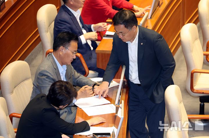 [서울=뉴시스] 조성봉 기자 = 유상범 국민의힘 원내운영수석부대표가 4일 오후 서울 여의도 국회에서 열린 제427회국회(임시회) 제3차 본회의에서 최형두(오른쪽) 의원과 대화를 하고 있다. 2025.08.04. [email protected]