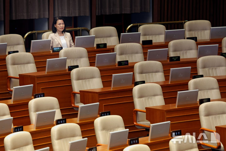 [서울=뉴시스] 김금보 기자 = 이진숙 방송통신위원회 위원장이 4일 오후 서울 여의도 국회에서 열린 제427회국회(임시회) 제3차 본회의에서 신동욱 국민의힘 의원의 방송3법 반대 필리버스터(무제한토론)를 듣고 있다. 2025.08.04. [email protected]