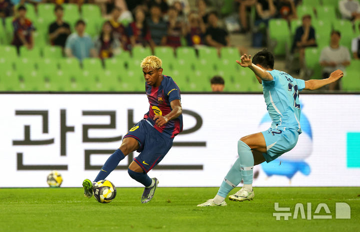 [대구=뉴시스] 이무열 기자 = 4일 대구 수성구 대구스타디움 경기장에서 열린 ‘FC바르셀로나 2025 아시아투어 에디션’ FC바르셀로나와 대구FC의 경기. FC바르셀로나 라민 야말이 돌파하고 있다. 2025.08.04. [email protected]