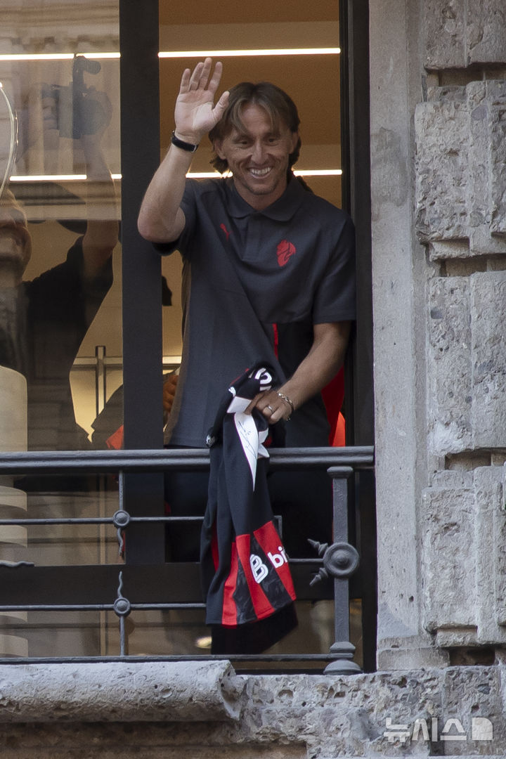 [밀라노=AP/뉴시스] AC 밀란 미드필더 루카 모드리치(오른쪽)가 4일(현지 시간) 이탈리아 밀라노에서 본인의 새로운 등번호 14번이 적힌 유니폼을 들고 팬들과 소통하고 있다. 레알 마드리드(스페인)에서 13시즌을 활약한 모드리치는 이번 여름 AC 밀란으로 이적했다. 2025.08.05.