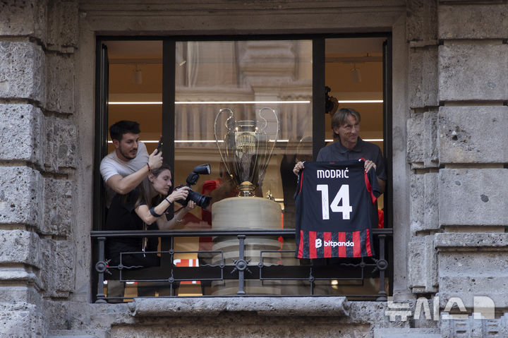 [밀라노=AP/뉴시스] AC 밀란 미드필더 루카 모드리치(오른쪽)가 4일(현지 시간) 이탈리아 밀라노에서 본인의 새로운 등번호 14번이 적힌 유니폼을 들고 팬들과 소통하고 있다. 레알 마드리드(스페인)에서 13시즌을 활약한 모드리치는 이번 여름 AC 밀란으로 이적했다. 2025.08.05.