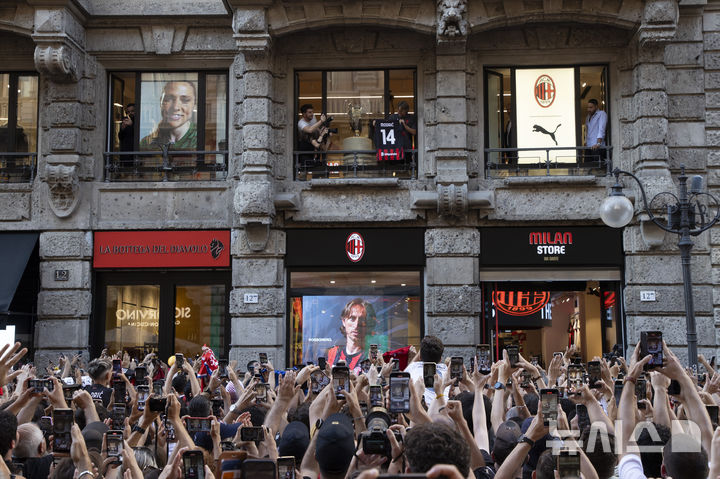 [밀라노=AP/뉴시스] AC 밀란 미드필더 루카 모드리치(오른쪽)가 4일(현지 시간) 이탈리아 밀라노에서 본인의 새로운 등번호 14번이 적힌 유니폼을 들고 팬들과 소통하고 있다. 레알 마드리드(스페인)에서 13시즌을 활약한 모드리치는 이번 여름 AC 밀란으로 이적했다. 2025.08.05.