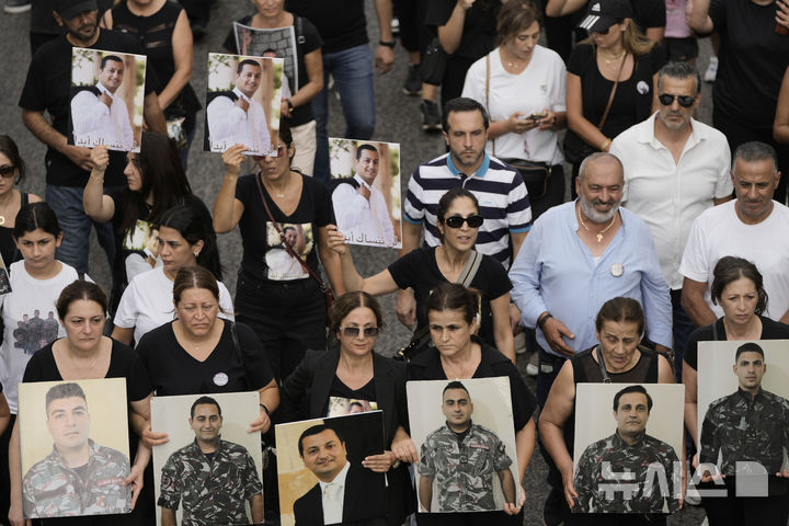 [베이루트=AP/뉴시스] 4일(현지 시간) 레바논 베이루트 항구 앞에서 베이루트 항구 폭발 5주기를 맞아 희생자 유족들이 희생자들 사진을 들고 고인들을 애도하고 있다. 2020년 8월 4일 베이루트 항구에서 약 2750톤의 질산암모늄이 폭발해 200여 명이 숨졌다. 2025.08.05.