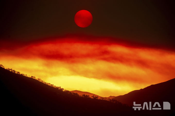 [로스파드리스 국유림=AP/뉴시스] 4일(현지 시간) 미 캘리포니아 로스파드리스 국유림 위로 해가 지는 가운데 '기퍼드 파이어' 산불로 발생한 연기가 붉게 물들고 있다. 2025.08.05.