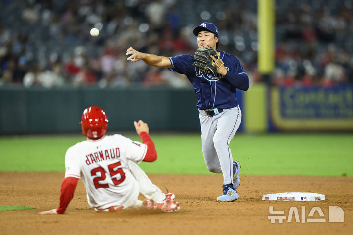 [애너하임=AP/뉴시스] 탬파베이 레이스 2루수 김하성이 4일(현지 시간) 미 캘리포니아주 애너하임의 에인절 스타디움에서 열린 2025 메이저리그 LA 에인절스와의 경기 6회 말 병살 수비를 하고 있다. 김하성은 3타수 1안타 1볼넷을 기록했고, 탬파베이는 1-5로 역전패했다. 2025.08.05.