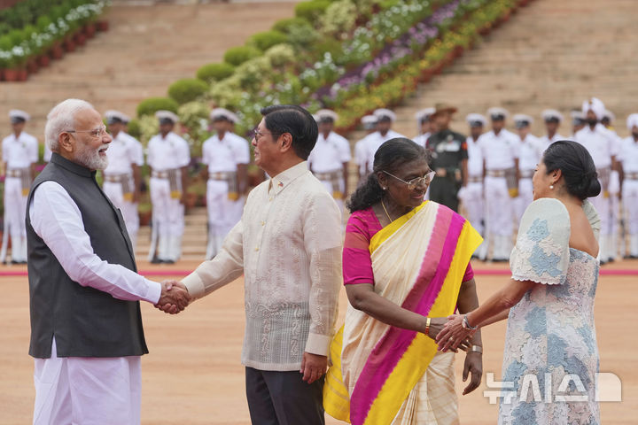 [뉴델리=AP/뉴시스] 나렌드라 모디(왼쪽) 인도 총리와 드라우파디 무르무(오른쪽 세 번째) 인도 대통령이 5일(현지 시간) 뉴델리 대통령궁에서 페르디난드 마르코스 주니어 대통령 내외를 영접하고 있다. 마르코스 대통령은 8일까지 인도를 국빈 방문한다. 2025.08.05.