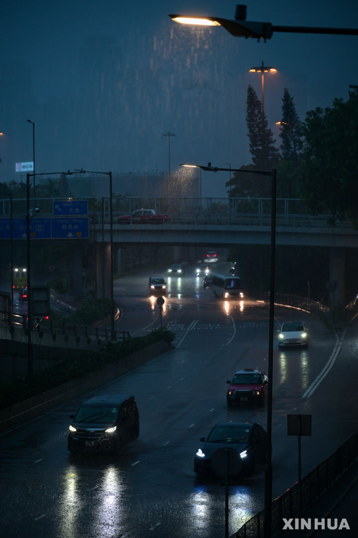 [홍콩=신화/뉴시스] 5일 새벽(현지 시간) 중국 홍콩의 한 도로에서 차량이 빗속을 달리고 있다. 홍콩 천문대는 이날 오전 최근 1주일 사이에 4번째로 흑색 폭우 경보를 발령했다. '흑색 경보'는 홍콩의 3단계 폭우 경보 중 최고 수준으로, 시간당 70㎜를 초과하는 폭우가 내릴 것으로 예상될 때 발령되며 심각한 홍수와 산사태도 우려된다. 2025.08.05.