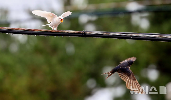 [서귀포=뉴시스] 우장호 기자 = 5일 오전 제주 서귀포시 대포동 인근 거리 전신주에 이소를 앞둔 흰색 제비가 날아와 어미새에게 먹이를 받아 먹고 있다. 2025.08.05. [email protected]