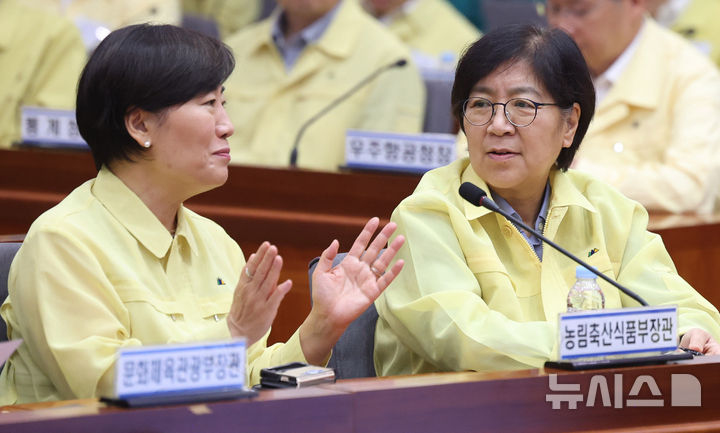 [서울=뉴시스] 추상철 기자 = 송미령 농림축산식품부 장관과 정은경 보건복지부 장관이 5일 오후 서울 종로구 정부서울청사 별관에서 열린 '을지연습 준비 보고회의' 시작 전 대화를 하고 있다. 2025.08.05. [email protected]