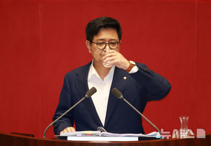 [서울=뉴시스] 고승민 기자 = 김장겸 국민의힘 의원이 5일 서울 여의도 국회에서 열린 제427회 국회(임시회) 제3차 본회의에서 방송문화진흥회법 일부개정법률안(대안) 관련 무제한 토론을 하던 중 물을 마시고 있다. 2025.08.05. [email protected]