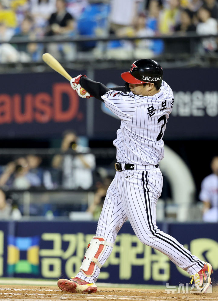 [서울=뉴시스] 김진아 기자 = 5일 서울 송파구 잠실야구장에서 열린 2025 KBO리그 두산 베어스와 LG 트윈스의 경기, 7회말 2사 1,2루 LG 문보경이 역전 3점 홈런을 치고 있다. 2025.08.05. [email protected]