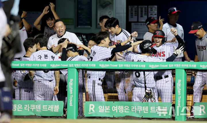 [서울=뉴시스] 김진아 기자 = 5일 서울 송파구 잠실야구장에서 열린 2025 KBO리그 두산 베어스와 LG 트윈스의 경기, 7회말 2사 1,2루 LG 문보경이 역전 3점 홈런을 친 후 더그아웃으로 들어가자 선수들이 기뻐하고 있다. 2025.08.05. [email protected]