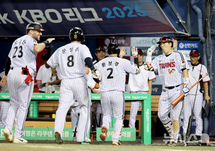 [서울=뉴시스] 김진아 기자 = 5일 서울 송파구 잠실야구장에서 열린 2025 KBO리그 두산 베어스와 LG 트윈스의 경기, 7회말 2사 1,2루 LG 문보경이 역전 3점 홈런을 친 후 더그아웃으로 들어가며 기뻐하고 있다. 2025.08.05. [email protected]