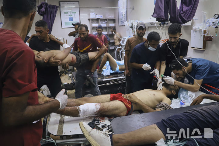 [칸유니스=AP/뉴시스] 5일(현지 시간) 가자지구로 들어오는 인도주의 구호 물품 수송 트럭에 접근하다가 다친 팔레스타인 주민들이 칸유니스에 있는 나세르 병원에서 치료받고 있다. 2025.08.06.