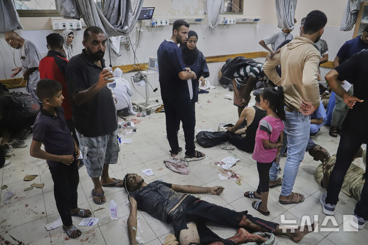 [칸유니스=AP/뉴시스] 5일(현지 시간) 가자지구로 들어오는 인도주의 구호 물품 수송 트럭에 접근하다가 다친 팔레스타인 주민들이 칸유니스에 있는 나세르 병원 바닥에서 치료받고 있다. 2025.08.06.