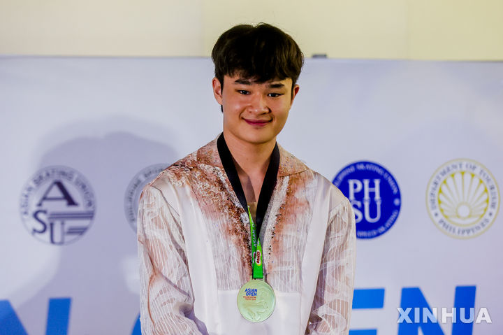[파사이=신화/뉴시스] 김현겸이 5일(현지 시간) 필리핀 파사이에서 열린 2025 아시안 오픈 피겨스케이팅 트로피 남자 싱글 시니어 정상에 올라 금메달을 목에 걸고 시상대에 올라 포즈를 취하고 있다. 김현겸은 프리스케이팅에서 기술 점수 75.61점, 예술 점수 67.39점, 합계 143.00점으로 쇼트 점수 72.14점과 최종 합산 215.14점으로 1위를 차지했다. 2025.08.06.