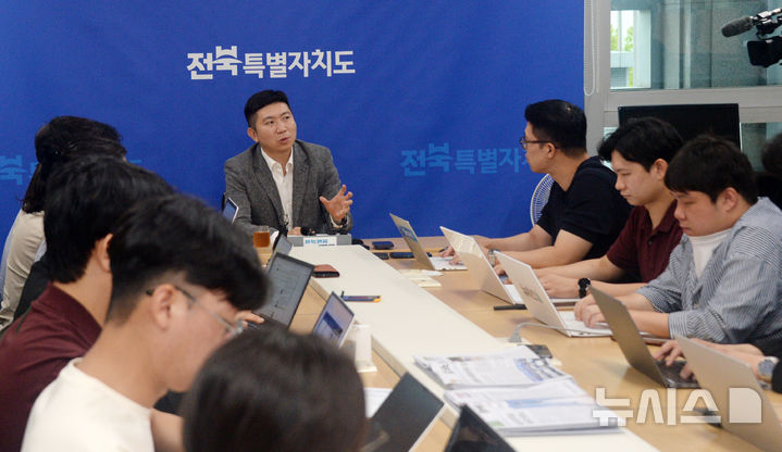 [전주=뉴시스] 김얼 기자 = 유승민 대한체육회장이 6일 전북 전주시 전북특별자치도청에서 열린 '올림픽데이런 2025 업무협약 체결식'에 앞서 기자실을 방문해 간담회를 갖고 질의에 답변하고 있다. 2025.08.06. [email protected]