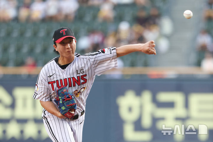 [서울=뉴시스] 황준선 기자 = 6일 서울 송파구 잠실야구장에서 열린 2025 KBO리그 두산 베어스와 LG 트윈스의 경기, 1회 초 LG 선발 최채흥이 공을 던지고 있다. 2025.08.06. [email protected]