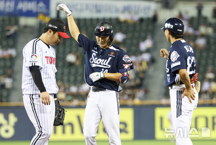 [서울=뉴시스] 황준선 기자 = 6일 서울 송파구 잠실야구장에서 열린 2025 KBO리그 두산 베어스와 LG 트윈스의 경기, 5회 초 1사 3루 두산 박계범이 1타점 적시타를 친 뒤 세리머니 하고 있다. 2025.08.06. [email protected]