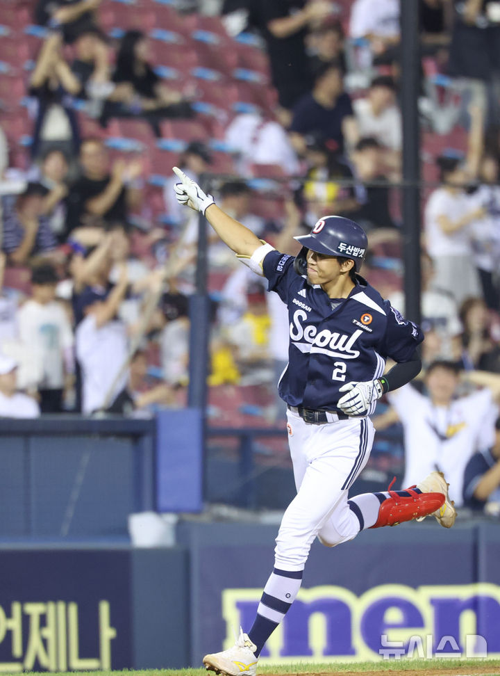 [서울=뉴시스] 황준선 기자 = 6일 서울 송파구 잠실야구장에서 열린 2025 KBO리그 두산 베어스와 LG 트윈스의 경기, 8회 초 2사 1루 상황 두산 김민석이 투런 홈런을 치고 그라운드를 돌고 있다. 2025.08.06. [email protected]