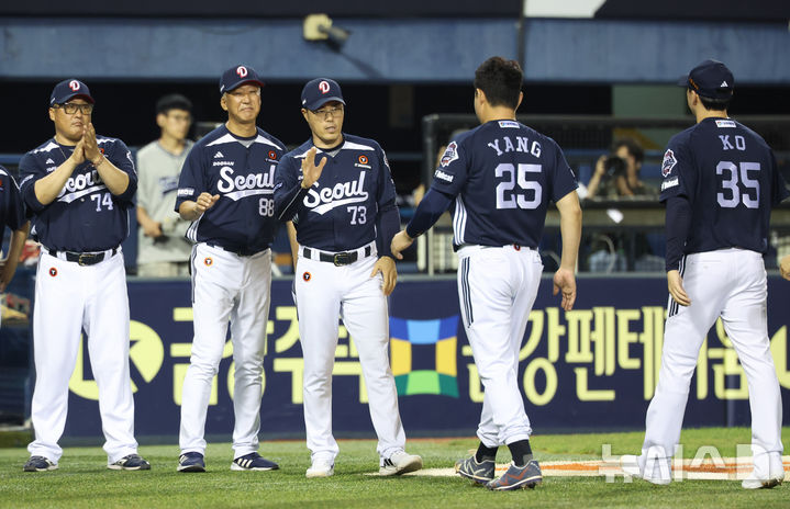 [서울=뉴시스] 황준선 기자 = 6일 서울 송파구 잠실야구장에서 열린 2025 KBO리그 두산 베어스와 LG 트윈스의 경기, 10-8로 승리한 두산 선수들이 자축하고 있다. 2025.08.06. [email protected]