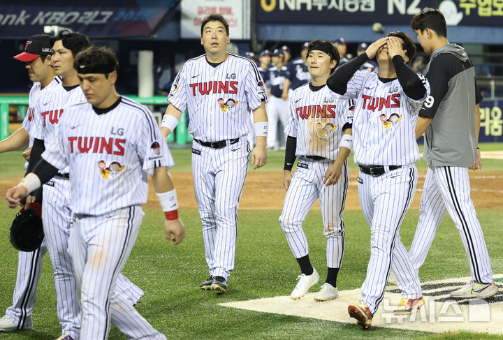 [서울=뉴시스] 황준선 기자 = 6일 서울 송파구 잠실야구장에서 열린 2025 KBO리그 두산 베어스와 LG 트윈스의 경기, 10-8로 패배한 LG 선수들이 아쉬워하고 있다. 2025.08.06. [email protected]