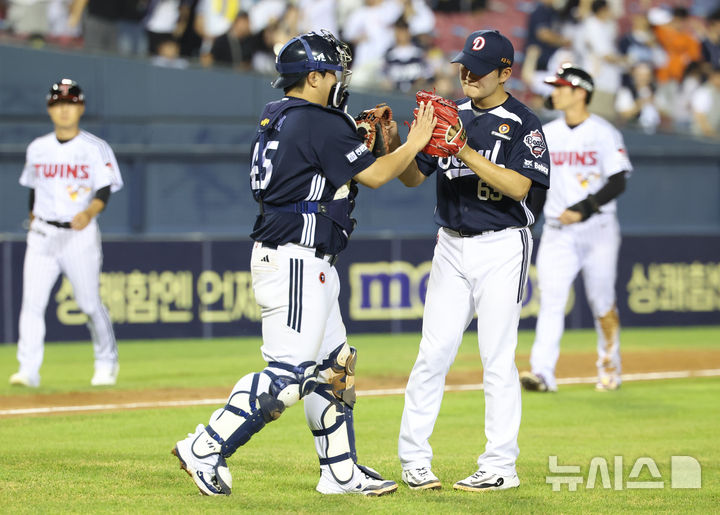 [서울=뉴시스] 황준선 기자 = 6일 서울 송파구 잠실야구장에서 열린 2025 KBO리그 두산 베어스와 LG 트윈스의 경기, 10-8로 승리한 두산 마무리 투수 김택연과 포수 김기연이 기쁨을 나누고 있다. 2025.08.06. [email protected]