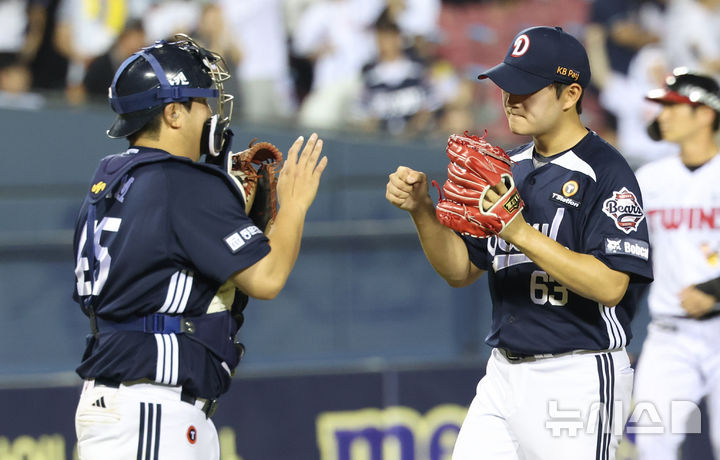 [서울=뉴시스] 황준선 기자 = 6일 서울 송파구 잠실야구장에서 열린 2025 KBO리그 두산 베어스와 LG 트윈스의 경기, 10-8로 승리한 두산 마무리 투수 김택연과 포수 김기연이 기쁨을 나누고 있다. 2025.08.06. [email protected]