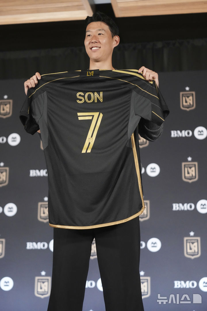 [로스앤젤레스=AP/뉴시스] 손흥민이 6일(현지 시간) 미 캘리포니아주 로스앤젤레스(LA)의 BMO 스타디움에서 열린 미국프로축구(MLS) LA FC 입단 기자회견에서 본인의 등번호 7번이 새겨진 유니폼을 들고 포즈를 취하고 있다. 2025.08.07.